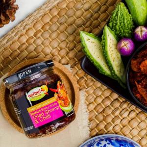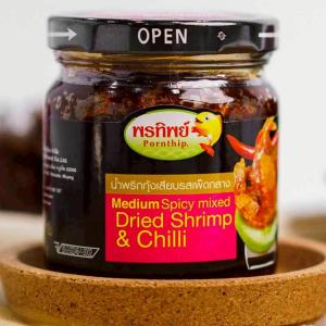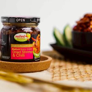 น้ำพริกกุ้งเสียบรสเผ็ดปานกลาง พร้อมทาน รสกลมกล่อม สามารถทานกับข้าวสวยร้อน ๆ ได้เลย หรือนำไปผัดคลุกเคล้ากับข้าว ปรุงรสเล็กน้อย
